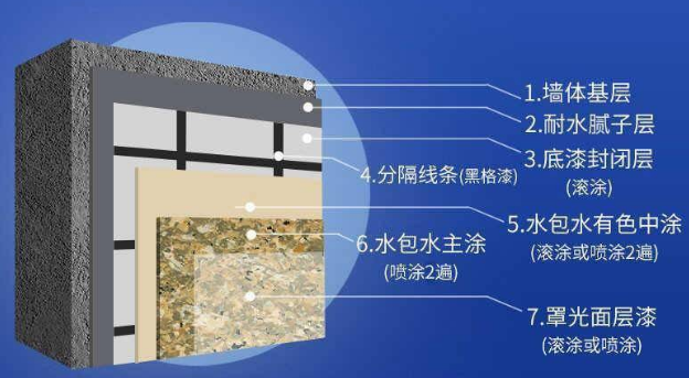 水包水—— 又名水包水多彩涂料,學(xué)術(shù)名稱叫做液態(tài)石。水包水涂料為純水性涂料。主要是由連續(xù)相和分散相 組成,兩者均為水性涂料 ,因此稱為水包水。水包水是仿大理石的紋路,由乳液+由涂料配置的彩粒+助劑制成;而真石漆是仿大理石的材質(zhì),由乳液+彩砂+助劑制成。真石漆表面摸起來(lái)像粗糙的石灰地面 水包水摸起來(lái)像瓷磚。如果一次性噴涂水包水,那么它的色彩就跟花崗石一樣的,而且整體看上去非常的逼真,據(jù)說(shuō)仿真程度能夠接近100%,所以水包水是花崗石最佳的代替品。