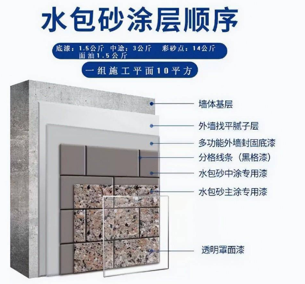 主要有普通涂料、質(zhì)感涂料、真石漆、多彩涂料。其中多彩涂料屬于真石漆的升級(jí)產(chǎn)品,包含水包水和水包砂兩種類別。如下圖。